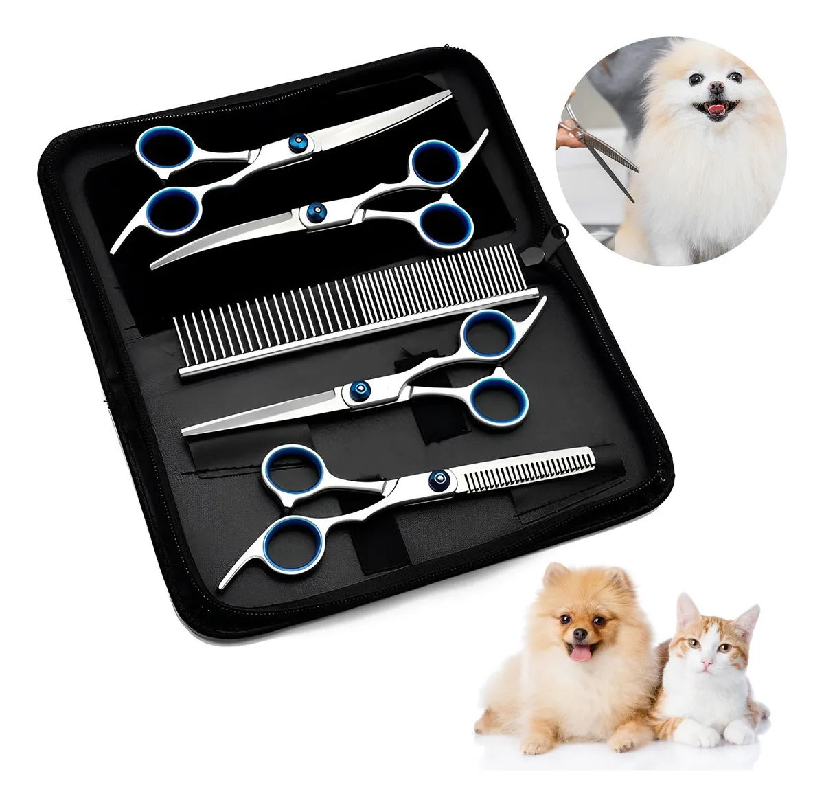 Combinação de tesouras selecionadas de aço inoxidável de 6 polegadas, duráveis, precisas e seguras. Ele pode aparar facilmente todas as partes do corpo do seu animal de estimação, atender às necessidades de estilo fino e cuidados básicos, melhorar a eficiência da higiene e o conforto do animal de estimação e é a escolha ideal para esteticistas profissionais e amantes de animais de estimação.
